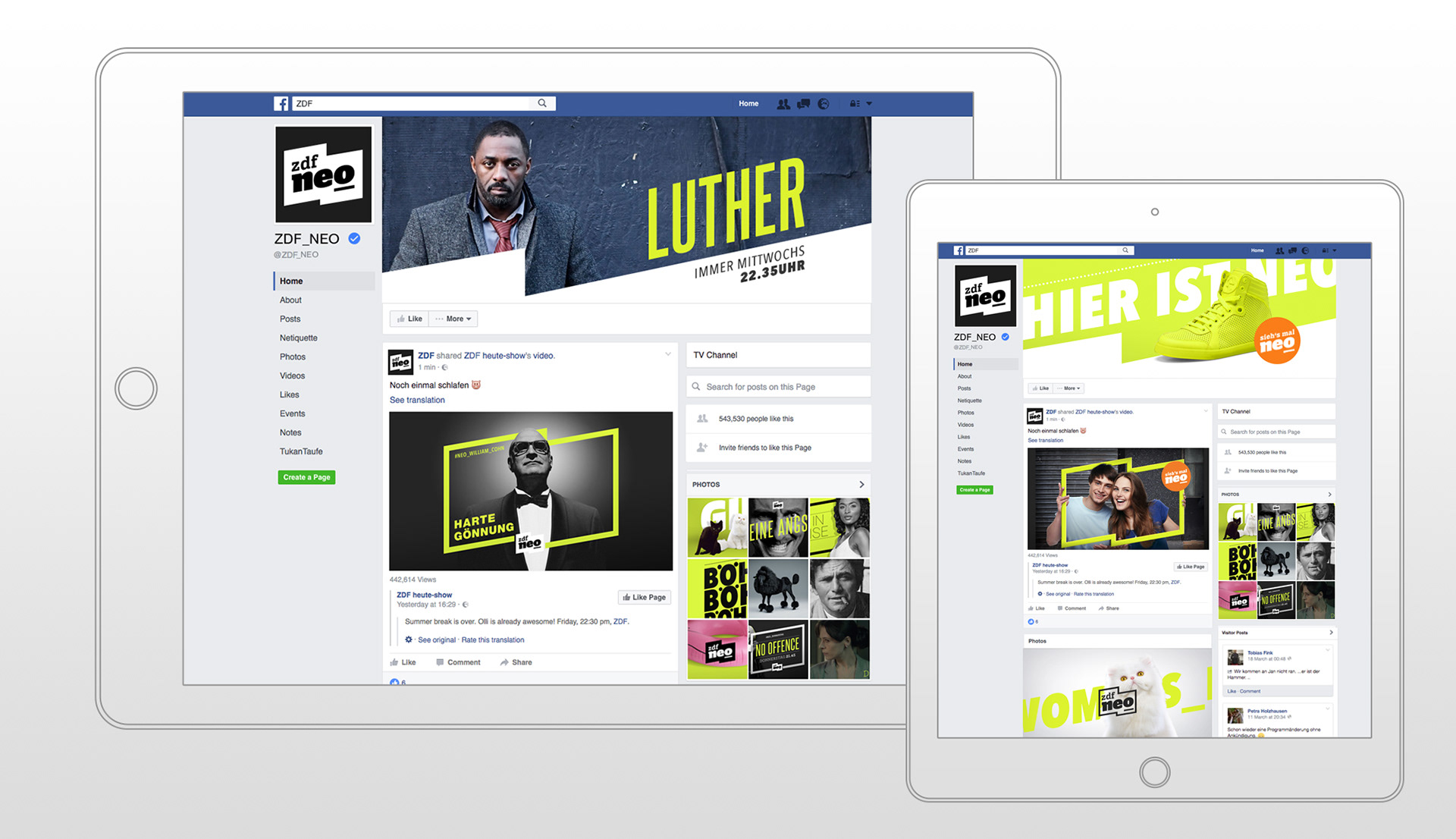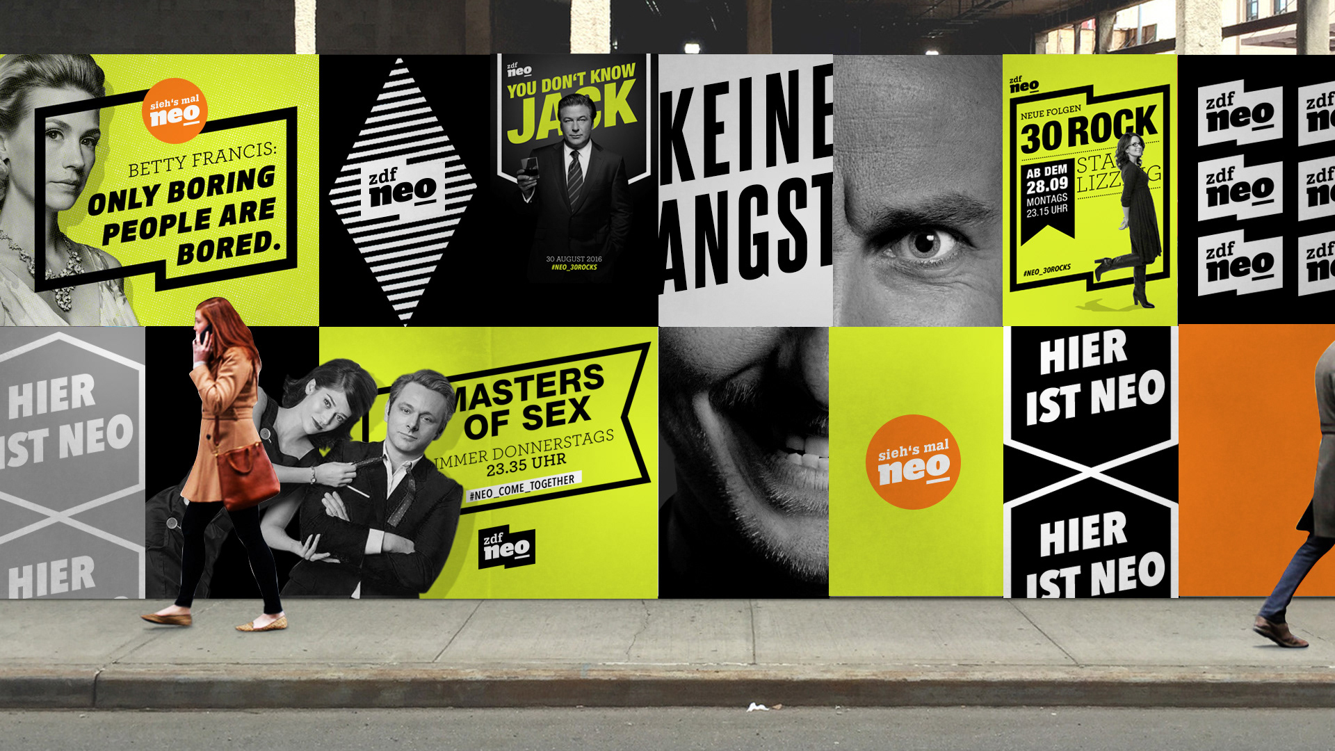 ZDFneo is a German television channel programmed for an audience aged 18 to 45 to counter the primarily older-skewing main channels of public broadcasters. It is known for its independent character and unapologetic attitude. As the lead Art Director at FEEDMEE Design at the time, I had the great pleasure of developing not only the new on-air channel identity, but the new logo and off-air concept as well. The bold and distinct look helped the network shine across all platforms and broaden its appeal as an unconventional and uncompromising choice for the target audience.